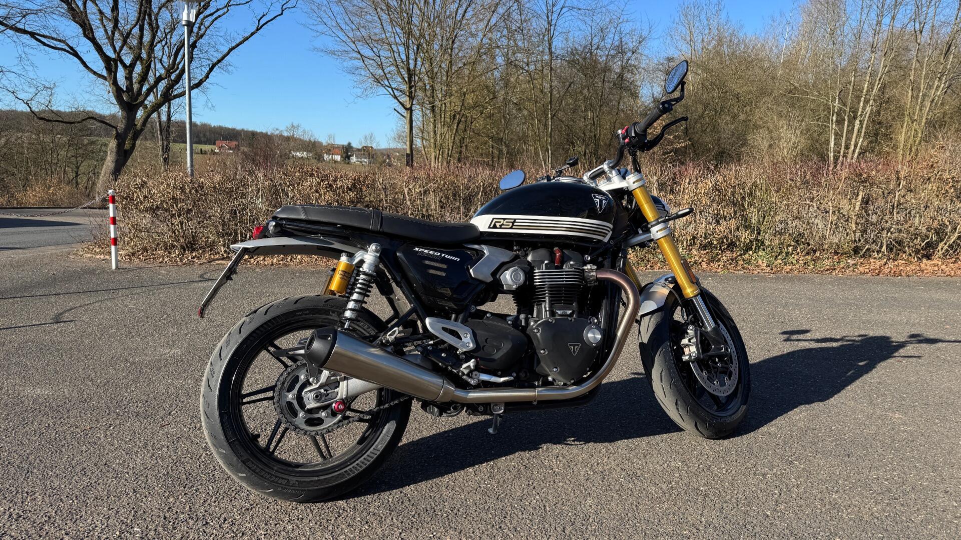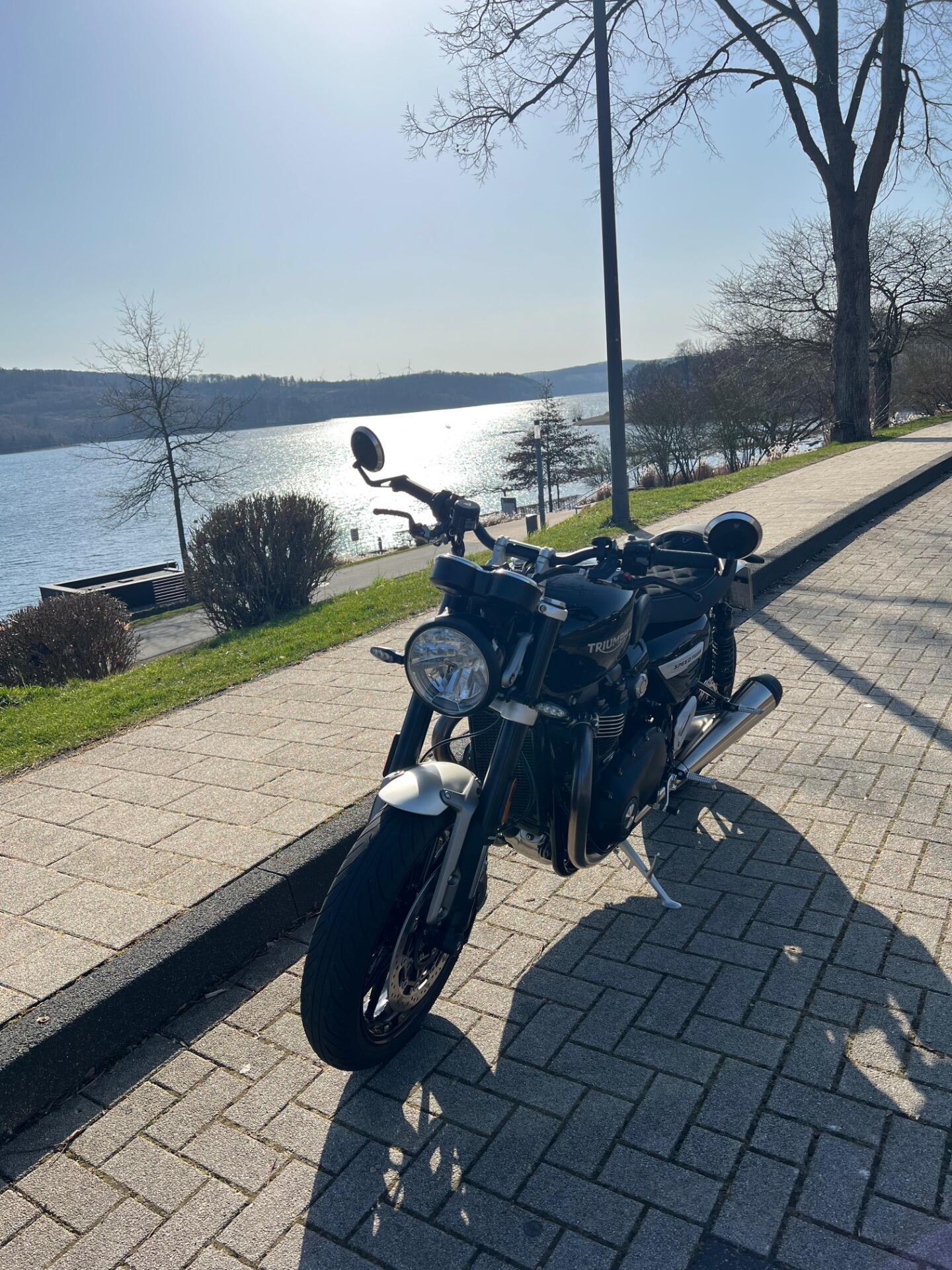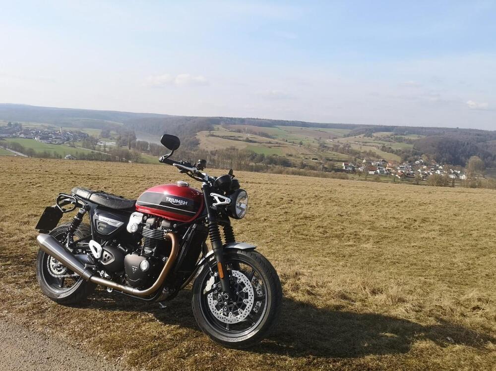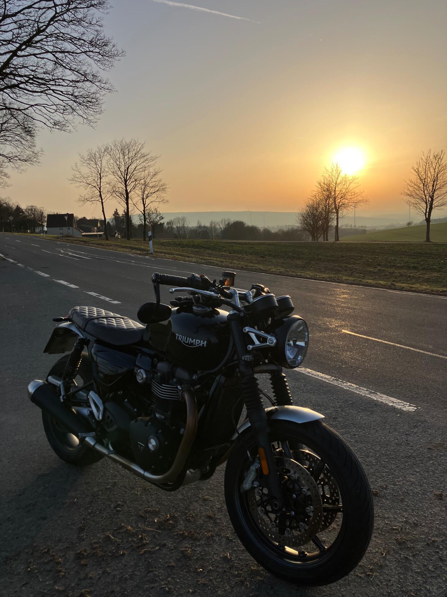 Sodele. Heute habe ich beim Dealer mal den Cafe Racer in Augenschein genommen. Das Arrangement mit Stummel und Rasten passt mir überraschend gut. Es bietet sich förmlich an für flotte Landstr. Runden so um 150bis 200km. Nur die Optik wirkt auf mich auch in Natura in so manchen Dingen einfach bissel zu dick aufgetragen. Weil ich schon da war und Zeit hatte, habe ich mir mal die Tiger Sport zur Brust genommen. Ich muss schon sagen , ein richtiges Wohlfühl Motorrad. Sie passt mir richtig gut und kalte Tage verlieren ihren Schrecken. Auch mit ihren netto preis könnte ich mich echt anfreunden und der 800er Motor ist eh ein Quell der Freude. Leggomio gefällt mir diese Karre Nein, probefahren werde ich sie nicht. Was will ich mit einem dritten Motorrad ? ..... und so weit, um dafür meine 2019 Speed Twin zu verkaufen bin ich noch lange nicht. ..... und dann habe ich mir aus dem Triumph Pflegeprogram noch dieses Protect & Shine für schlappe 15 Euro gekauft. Ist perfekt für alle metallenen Schwarzteile an der Speedy. Von der Gabel bis zu den Motordeckel bekommt dann alles einen wasser und schmutzabweisenden seidigen Schutzfilm. Ähnlich den MOTUL Shine & go welches inzwischen schlecht für michb zu bekommen ist Herrjenumollna ...... Grüße gerhard4 points