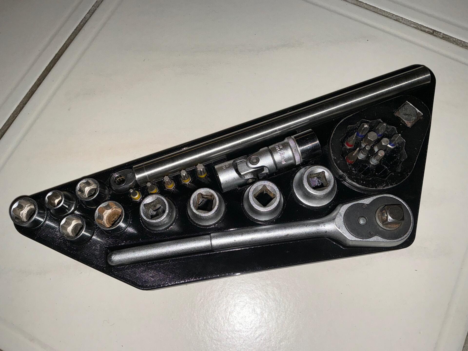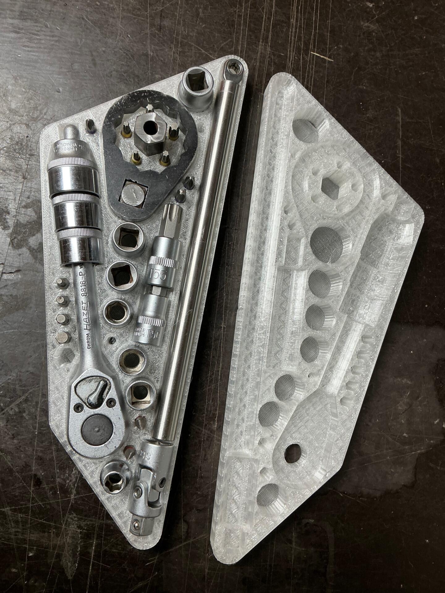Da das Wetter hier im Norden Deutschlands nun mal gar nicht zum Fahren einlädt, habe ich mal mein CAD Programm etwas gequält und einen Werkzeugeinsatz für meine 1200RP erstellt und auch gleich gedruckt, nach der 2. Version bin ich zufrieden, passt richtig gut, im Augenblick druckt gerade Deckel dazu, damit alles an der Stelle bleibt. In den nächsten Tagen ist die andere Seite für die restlichen Werkzeuge, Reifendichtmittel dran, ich hoffe, dass ich alles unter bekomme.9 points