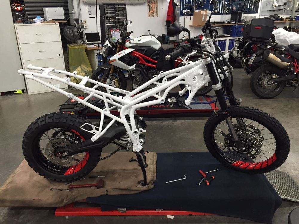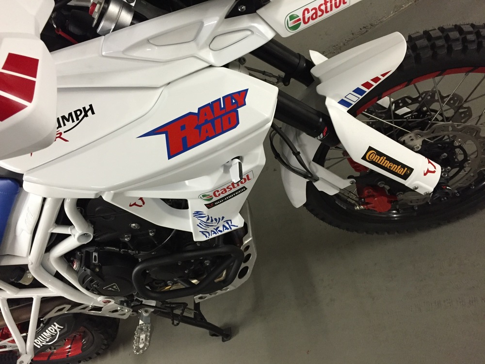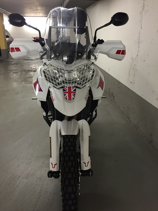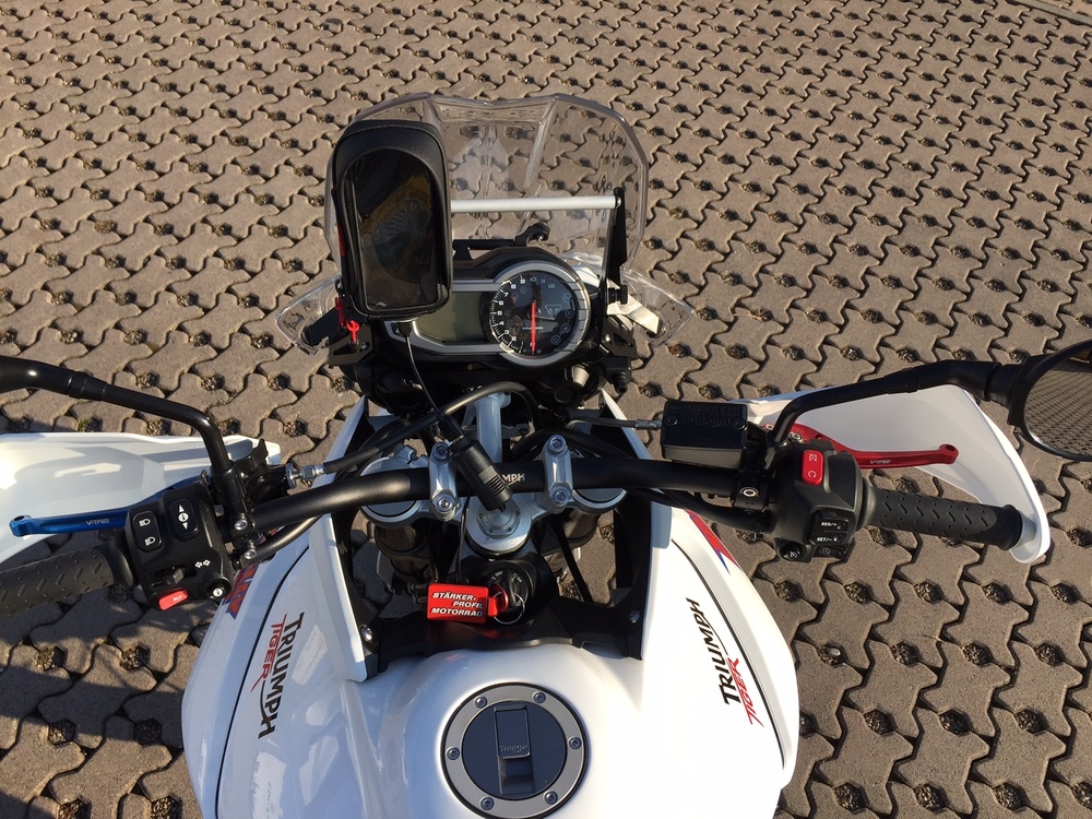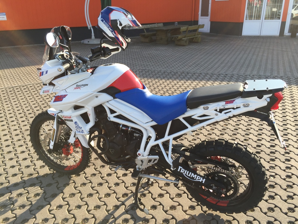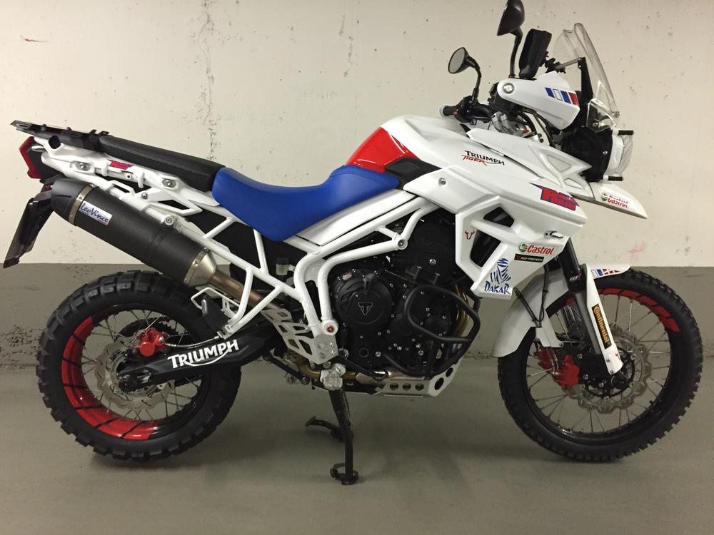 Ich und meine Tiger sind neu hier. Wie kam es dazu? Bisher fuhr ich eine KTM 950 Superenduro mit Safari Tank. Für mich eine zeitlang die Reiseenduro, da leicht und doch viel Power und man auch sportlich um die Ecken fetzten konnte und im gemäßigten Gelände noch eine gute Figur machte. Seit zwei Jahren warte ich warte ich auf eine leichte Reisenduro, und Honda hat sie angekündigt, jedoch letztendlich nicht gebracht. Als Alternative käme höchstens noch eine BMW F 800 GS in Betracht. Der Motor ist jedoch ziemlich langweilig. Eine Dreizylinder kam für mich als Enduro bisher nicht infrage. Als ideale Reiseenduro mit sportlichen Aspekten betrachtete ich grundsätzlich zwei Zylindermaschinen. Einzylinder haben dagegen einen zu begrenzten Einsatzbereich. Nun dann bin ich dann doch eine Tiger 800 XCx Baujahr 2015 Probe gefahren. Und ich war begeistert. Die White Power Feder Elemente schlucken auf schlechten Straßen alles gut weg, sehr handlich auf verwinkelten Landstraßen und auch auf der Bahn verhält sich das Moped äußerst Spur stabil. Der Motor ist eine Wucht, egal in welchem Gang du dich befindest er ist sofort da, immer Zug drauf, das ganze Drehzahlband. Und dann googelte ich noch das Rally Bike von Icon Raiden. Und es war mir klar, so sollte sie aussehen. Und so sieht sie nun aus. Da ich nicht beabsichtige Rallyes zu fahren, habe ich natürlich einige Equipments weggelassen, dafür andere hinzugefügt die mir wichtig waren. Nicht verbaut: - Kein Safari Tank, da das Serienfass in Europa ausreicht, als Zubehör jedoch 8 L. Hecktank von RallyRaid völlig ausreichend. Dieser Tank ist in Deutschland jedoch nicht zugelassen. Montiere ich nach bedarf. - Verzicht auf Rally-Cockpit, da ich keine Rallys fahren werde. - keine Öhlins Federelemente, da ich für meine Einsatzzwecke die white power Elemente völlig ausreichend. - kein 18 Zoll Hinterrad verbaut Verbaut: - LeoVince Endschalldämpfer, schöner und schlichter als Original. Gut im Test. - Wave Bremsscheiben, - vtrec brems- und Kupplungshebel rot und blau. - Versenschutz Alu sw-motech - sturzpads sw-motech (im Nachgang sehe ich den Sinn darin nicht, Moped fällt eh zuerst auf Verkleidung und hintere Fußrasten) - RallyRaid Gepäckbrücke - Touratech Alukettenschutz - klappbarer Schalthebel sw-motech - Seitenständerverbreiterung von altrider (die einzige, die mit Haupständer harmoniert) - windschildversteller Touratech - Lampenschutzgitter Touratech - Kotflügelhöherlegung Touratech - LED Blinker weiß Triumph - Conti TKC 80 - Kühlerschutz Alu Triumph - und noch ein paar optische gimicks Motorrad wurde zerlegt. Tank und Rahmen weiß glänzend, restliche Verkleidungsteile weiß matt. Felgen und Bremssättel rot lackiert. Sitzbank Fahrer blau bezogen. Angstgriffe Beifahrer entfernt. Ich denke, das das Moped 5-6 Kilo leichter sein wird. Ich überlege mir noch, ob ich die motorschutzbügel abbaue. Denn zunächst fällt das Bike auch im Gelände auf Tank und Fußrasten. Schweres Gelände kann man damit eh nicht fahren, daher ist ein aufschlagen des Motors auf einen Fels unwahrscheinlich. Spart bestimmt nochmal 2 Kilo, und das insbesondere an der Front. Und mein Triumph Händler, die Lackiererei, Sattler und Designer haben hier in Erfurt hat eine super Arbeit geleistet. Nun, bin gespannt was die Tiger-Gemeinde dazu sagt.