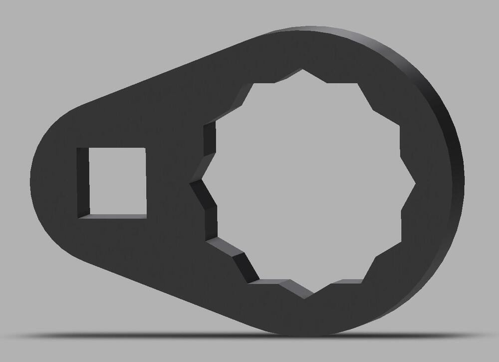 Habe mir mal Gedanken zum Hinterradwechsel, Radausbau gemacht, da mir zu Hause zwar eine 36er Vielzahnnuss gute Dienste leistet, finde ich sie für Unterwegs deutlich zu sperrig und schwer, das Gewicht konnte ich zwar nicht großartig reduzieren, aber das Packmass deutlich zweidimensionaler machen?, da hier doch schon ordentliche Momente übertragen werden, habe ich das mal aus 10mm Werkzeugstahl auslasern lassen (nein, kann ich nur für mich machen lassen?) und das Vierkannt ist 1/2“, also für eine 1/2“Knarre.