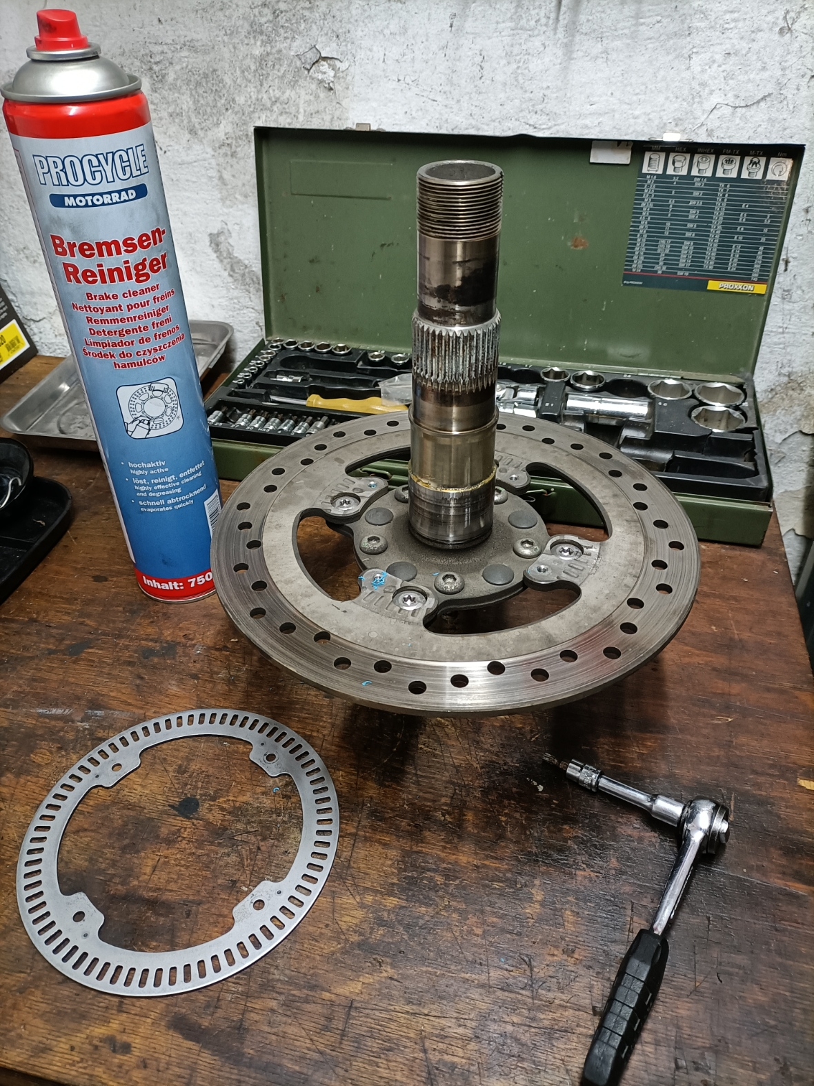 eickerberger Posted March 13, 2022 Posted March 13, 2022 (edited) Ich wollte 'mal eben' die hintere Bremsscheibe an meiner Sport tauschen, aber ganz so einfach, wie z.B.bei der Bandit ist es nicht: Bei Motorrädern mit konventioneller 2-Arm Schwinge sind die Scheiben in der Regel mit ein paar Schrauben und flüssiger Schraubensicherung an der Felge befestigt. Hier bei der hübschen Einarmschwinge finde ich nach dem Ausbau der Felge ein Verschraubung an der Bremsscheibe vor, an die man so ohne Weiteres gar nicht dran kommt. Frage an die Erfahrenen: Was muss ich denn alles abbauen, um da vernünftig ran zu kommen? Muss ich ganz links die 46-er Achsutter lösen und die ganze Achse ausbauen? Oder geht's doch noch einen Tick einfacher? Viele Grüße, Uli Edited March 13, 2022 by eickerberger Quote