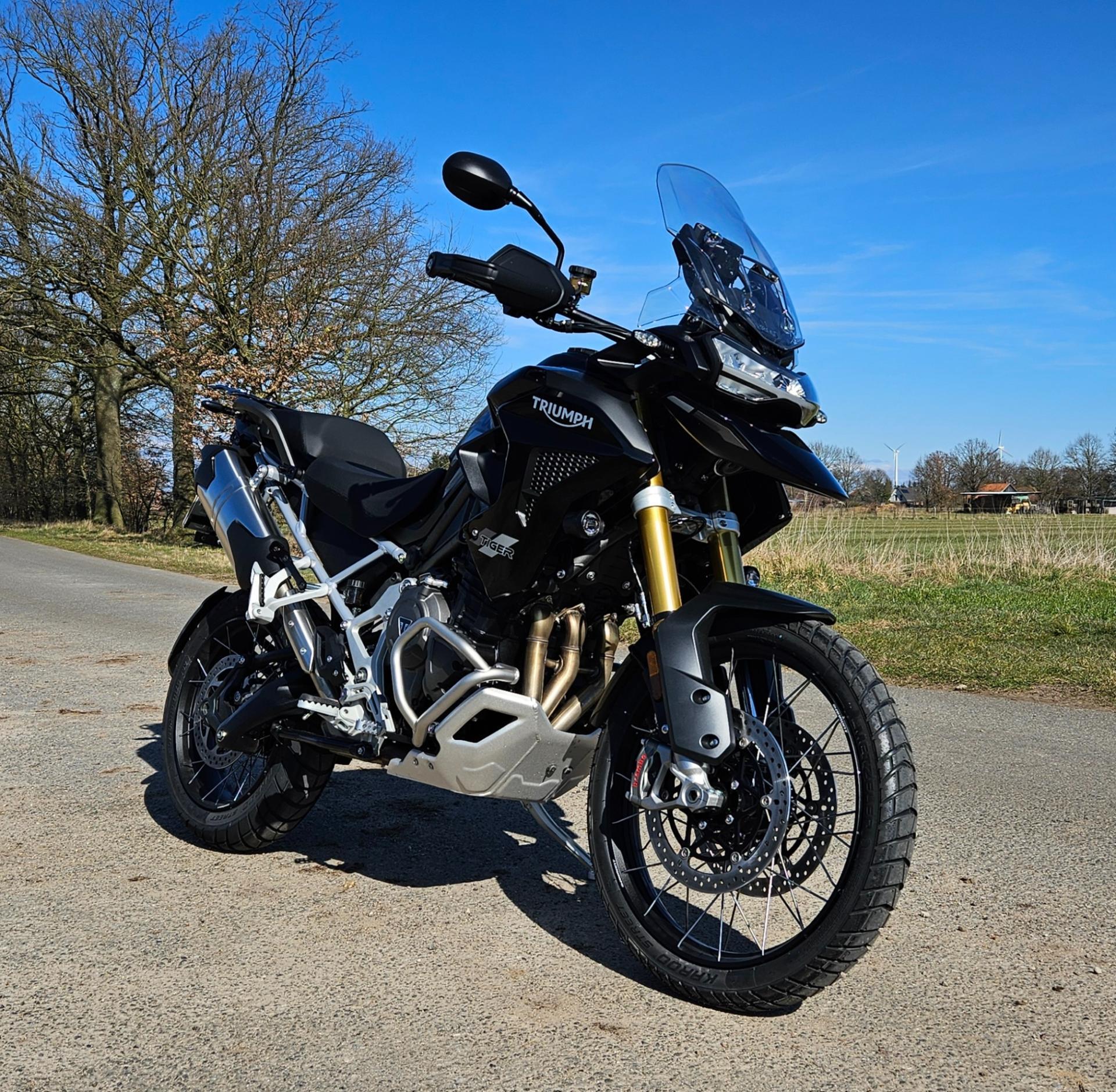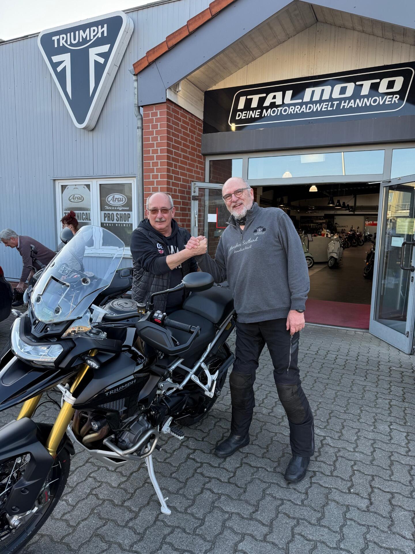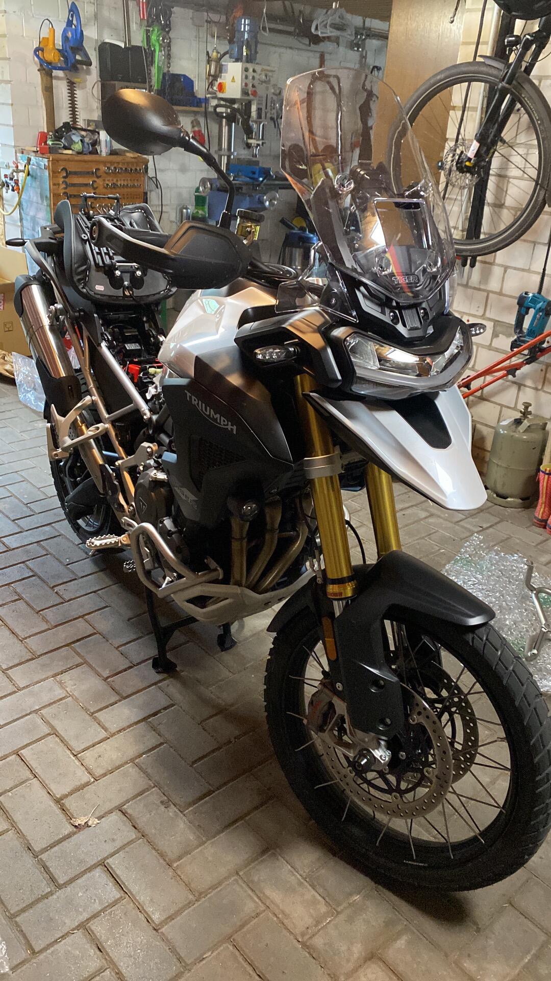 Skipperwilli Posted Thursday at 06:26 PM Posted Thursday at 06:26 PM Hallo zusammen, nach 14 glücklichen Jahren mit meinem alten Tiger, 800er XC, ist mir ein gutes Angebot zugelaufen, eine 1200er Rally Pro Katze, Bj. 11/2024, EZ 3/2025 als Vorführer beim Händler, der sich in einer Insolvenz befindet und kein Triumph Händler mehr ist. Da musste wohl der Fahrzeug Brexit vollzogen werden. Naja, mit 800km auf der Uhr vorgestern abgeholt, heute 1100 erreicht und ich bin Happy. Tolles Agiles Moped, Kupplung war nicht gut eingestellt, zu viel Schlupf und rutschte in den hohen Gängen mit Gas ab 5000 durch, lässt sich aber easy mit ner halben Drehung am Gestänge korrigieren, etwas Kühlmittel müsste rein, fülle ich morgen nach. Im Mai geht es in die Pyrenäen und dann werden wir sehen, wie die große Katze Schotter und Gelände kann, vor 6 Jahren war ich da schon mit der 800er, mal sehen wie sich der große Elektronik rocken dagegen schlägt. Aber die Rally Pro passt mir mit 1,93m super, jetzt fahre ich wirklich entspannt und aufrecht. 1 Quote