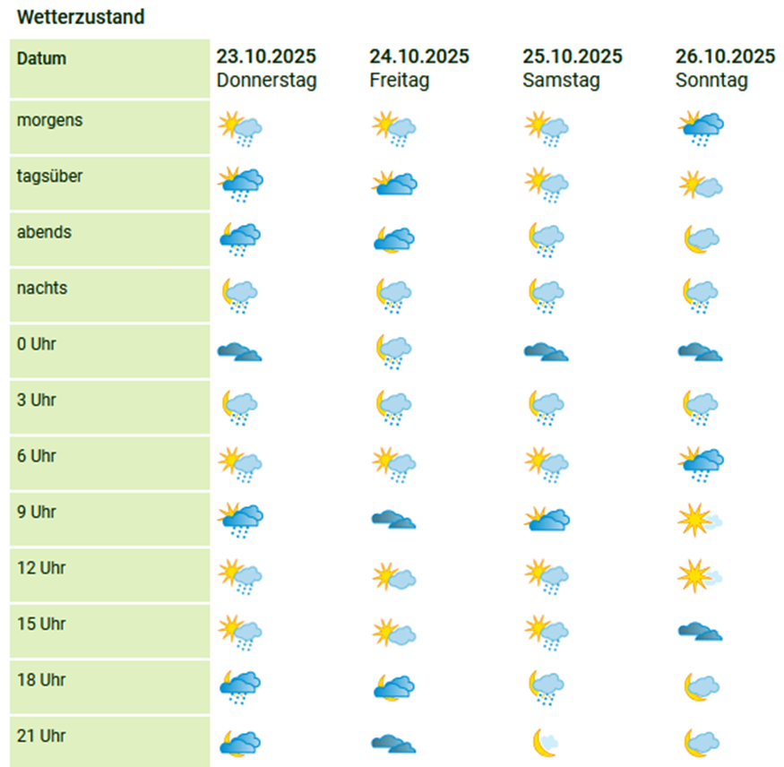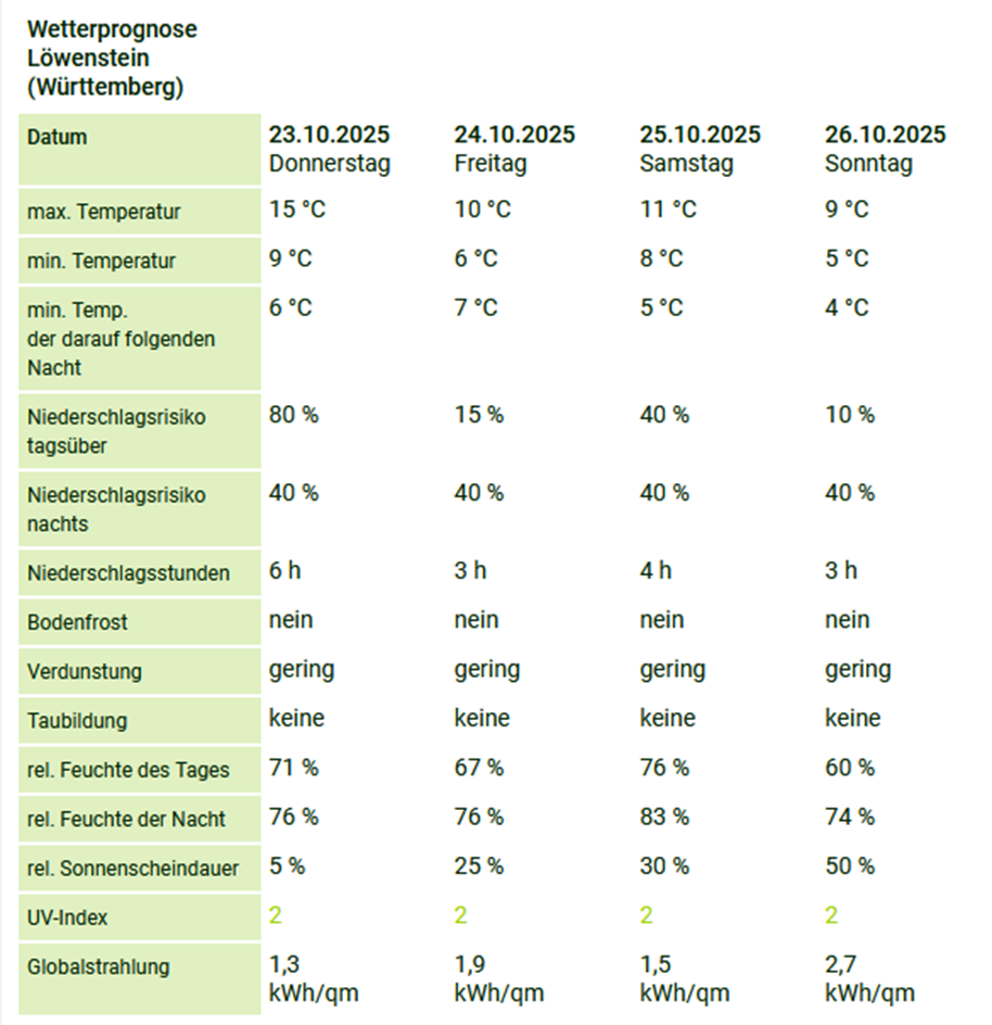 joe3l Posted October 23 Posted October 23 Mal ein Tipp von mir. Wenn man exaktes Wetter vorhergesagt haben möchte, muss man den Agrarwetterbericht der betroffenen Region abrufen. Und nach diesem gibt es auf der Platte zwar keinen "Goldenen Oktober", aber es ist nicht unzumutbar. Alle Angaben ohne Gewähr, ohne Schießgewehr......ich gebe nur wieder, was dieser Bericht vorhersagt Gruß joe 1 Quote