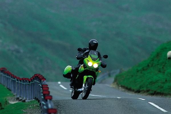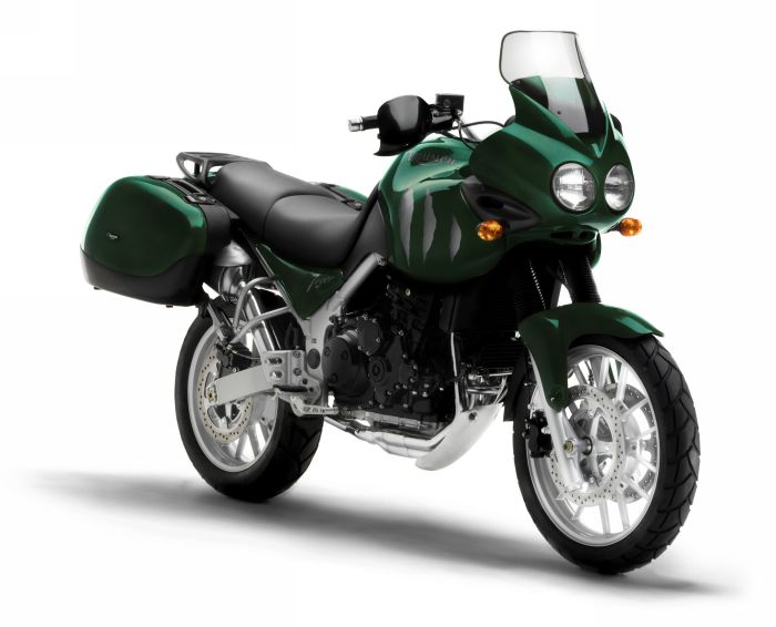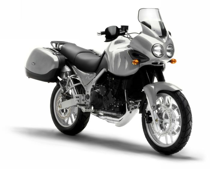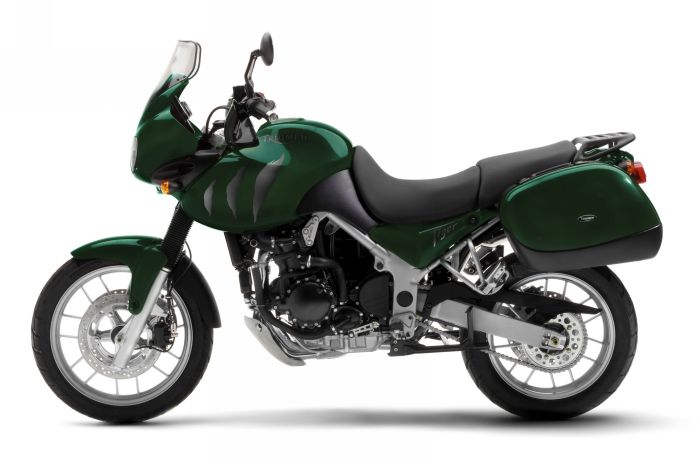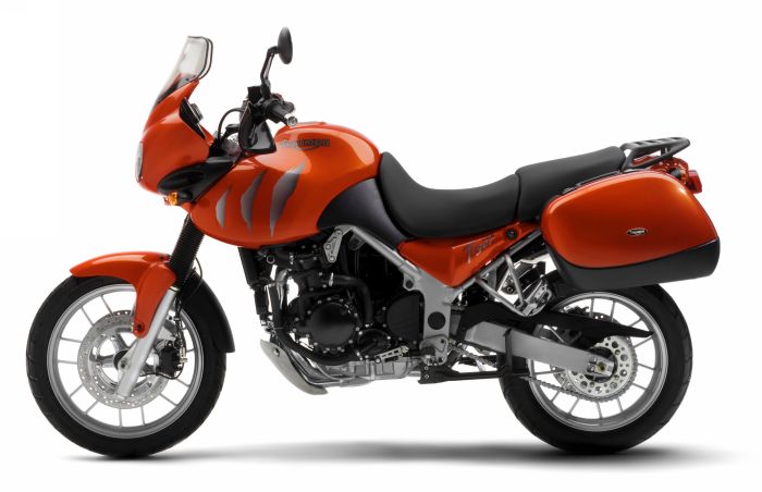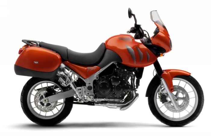 | Hier ein paar Fotos des letzten Generation. Die Tiger wird seit '05 mit Gussspeichenrädern ausgeliefert. Vorteile: Putzen dauert nicht mehr so lange, schlauchlose Reifen können gefahren werden. Nachteile: kein Radumbau auf andere Größen ohne Riesenkosten mehr möglich. Das Einstellen der Spur ist von nun an auch nicht mehr so "stilvoll". Die neuen Grafix der Tiger sehen bei näherer Betrachtung leider auch nicht gerade edel aus. Hier wurde nämlich mit den menschlichen Limits gespielt. Aus 5 Metern Entfernung wirken die Aufkleber schon wie Farbverläufe und sehen recht gut aus. Allerdings liefert Triumph nun Koffer und Hauptständer serienmäßig dazu. | ||||